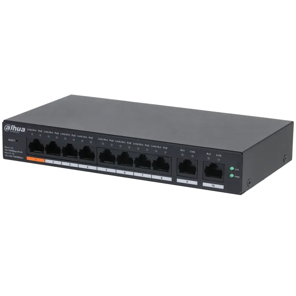 DH-CS4010-8ET-60. Switch dahua cloud de 8 puertos PoE 10/100 Mbps 2 puertos Uplink de 10/100/1000 Mbps, soporta máximo 60W entre todos sus puertos PoE