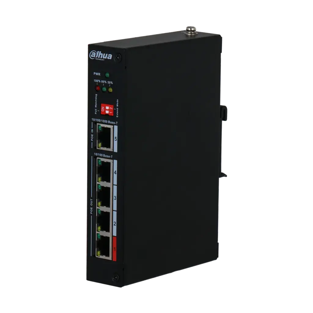 Extensor PoE Dahua DH-PFT1500 de 5Puertos con 4 puertos 100 Mbps PoE y 1 Puerto 1000 Mbps PoE, ideal para instalaciones a riel dinámico. Expand your network effortlessly.