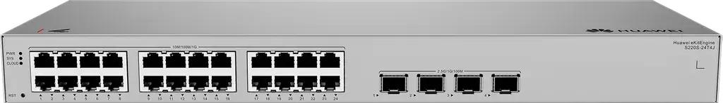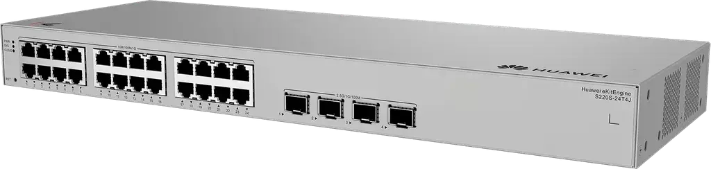 Switch Huawei eKit S220S-24T4J con 24 puertos 10/100/1000Base-T, 4 Puertos 2.5GE SFP. Conmutación de 68 Gbit/s y reenvío de paquetes de 51 Mpps. Escalable y eficiente para redes empresariales. ¡Cotiza ahora!