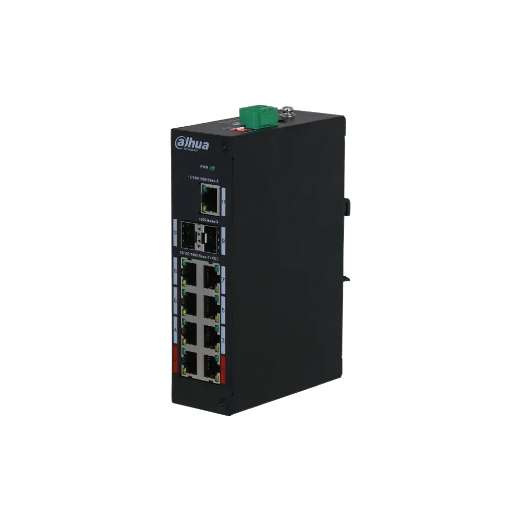 Switch PoE Industrial de alto rendimiento con 8 puertos PoE de 1Gbps, 2 puertos SFP y 1 puerto Uplink. Potente y eficiente, 120W de alimentación. Ideal para entornos industriales sin necesidad de administración. ¡Descubre su gran capacidad de conexión!