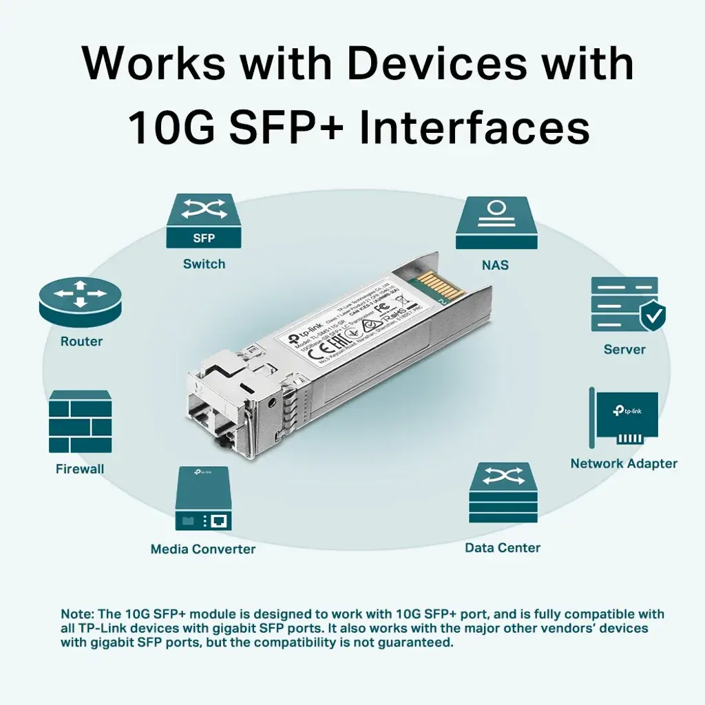 - Compatibilidad: Totalmente compatible con switches que incluyan puertos 10G SFP+, como el TL-SG34, garantizando una integración sin problemas.