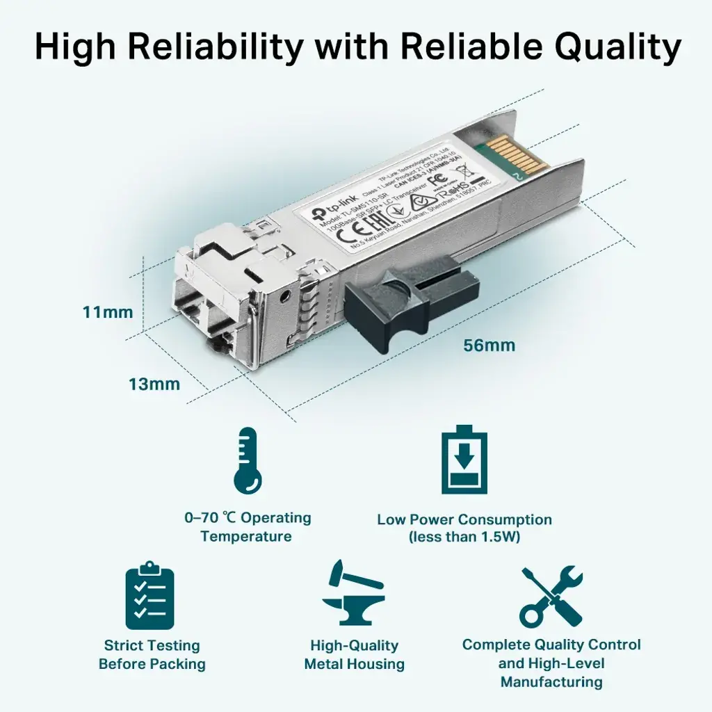 En resumen, el transceptor LC 10GBase-SR SFP+ TL-SM5110-SR es la elección perfecta para aquellos que buscan una solución de calidad, rendimiento y velocidad en sus redes empresariales.